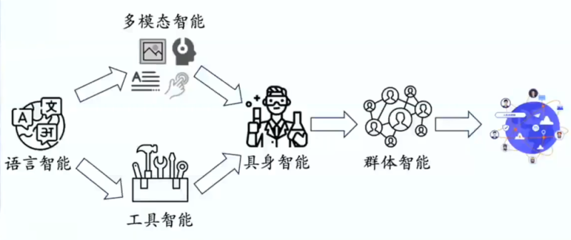 也因为这两方面的突出优势,大模型有潜力成为智能时代基础设施。刘知远认为,迈向通用人工智能的路径会是语言智能、多模态智能、工具智能、具身智能、群体智能,目前人类语言的智能已经基本被实现了,接下来会是其他智能相关探索。