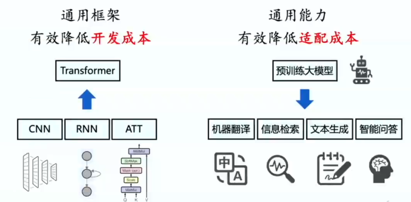 可以说,大模型是迈向通用人工智能的技术。刘知远总结了大模型在两方面的优势,首先,是通用框架,能有效降低开发成本。自上世纪五十年代以来,成千上万个不同的神经网络解决方案被提出过,但在2017年Transformer被提出来后,这些神经网络架构日益混凝在Transformer架构下,2020年后大模型的发展,让大语言模型架构更加统一。