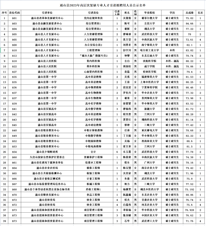 根据《通山县2023年高层次紧缺专业人才引进公告》要求,经笔试、面试、体检和考察等程序,现将吴箫笛等39名拟聘用人员予以公示(具体名单见附件),公示时间为5个工作日。